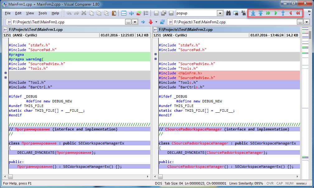To make recognition of file differences more convenient and increase your productivity during comparison Visual Comparer has a number of additional actions with Comparison Panes, namely: