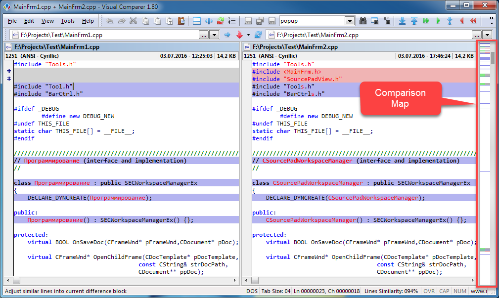 For convenient moving and full scope of file differences Comparison Map is intended. It consists from area of differences and scrollbar. Using Comparison Map, you can move quickly through the differences. You can do it both with help of scrollbar and direct cursor positioning. Simply click on required difference area to see necessary difference block.