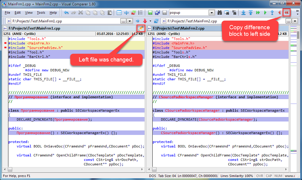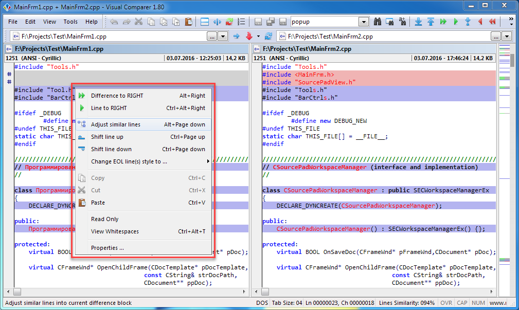 - Visual Comparer showing some lines as equal, being really different (for instance, "ignore all spaces" comparison flag being on), you can synchronize these lines with "Different to LEFT/RIGHT" and "Line to LEFT/RIGHT" commands;
