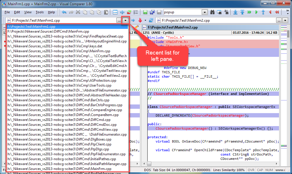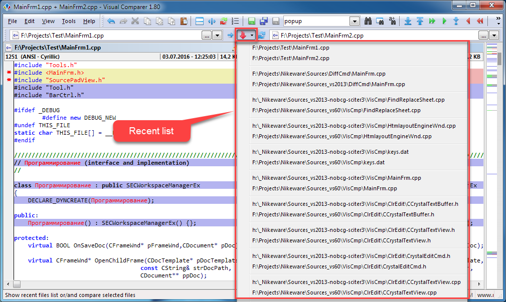 - the recent files list drop down menu redesigned. Now file pairs are arranged one under another;
